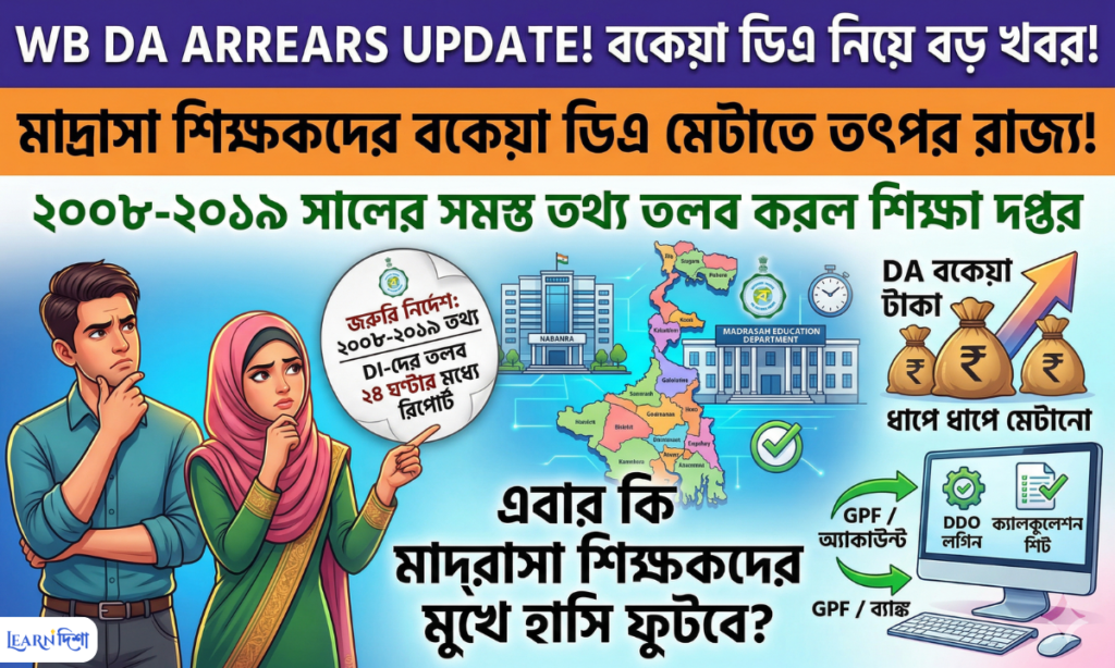 WB DA Arrears: অবশেষে দীর্ঘ প্রতীক্ষার অবসান হতে চলেছে! রাজ্যের গ্রান্ট-ইন-এইড (Grant-in-aid) মাদ্রাসা শিক্ষক ও শিক্ষাকর্মীদের বকেয়া মহার্ঘ ভাতা বা ‘WB DA Arrears’ মেটানোর কাজে এবার রীতিমতো কোমর বেঁধে নামল পশ্চিমবঙ্গ সরকারের মাদ্রাসা শিক্ষা দপ্তর। প্রক্রিয়াটি যাতে দ্রুত শেষ করা যায়, তার জন্য নেওয়া হয়েছে এক অত্যন্ত গুরুত্বপূর্ণ পদক্ষেপ।
